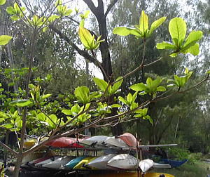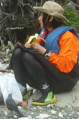 | 小笠原初日、すんごく天気は良くて、海はベタ凪! いつものように、初日は島内巡りと、軽く山歩き(?)かと思っていた。 ところが、現地ガイドの金子さん、「明日から海がどうなるかわからないので、今日さっそく漕ぎましょう!」と告げられた。 96年から毎年来ていて、今まで、多少天気が悪かろうが、多少海が荒れていようが、島のどこかでなんとか漕いで楽しんできた。 それが・・・・・!! こんなことは初めて! よっぽど!・・・・ でも、それをウレいたって、クヨクヨしたって、天候・海況を変えられるわけではなし。 明日は明日の風が吹くし、予報だって外れるかもしれない! 出かけてしまったら、ドシャブリの雨の朝でも、「いい天気だね!」と笑顔で挨拶して、フィールドに出ていき、その場を楽しむ。クヨクヨは無しで楽しむしかない! そんなZEN流holoholoツーリングはもう始まっているのだ。 行くっきゃないのだ! とか言っても、緊迫感は皆無で、小笠原名物の島寿司を仕入れて、のんびり扇浦のビーチで昼食。 食後のデザートにモモタマナの実アミヤを探し出し、大試食会が始まってしまった。拾っては割って、食べて、拾っては割って食べて・・・・・・! その後もみんなはあたりをビーチコ−ミングして、だーれも、早く漕ぎ出そうよーってせかす者はいない。 参加者は全員シーカヤック所持者で生粋のカヤッカ−である。うーん、後になって考えても不思議だ−。 全員カヤッカ−からアイランダ−になったんだね。 いいぞ!いいぞ! |