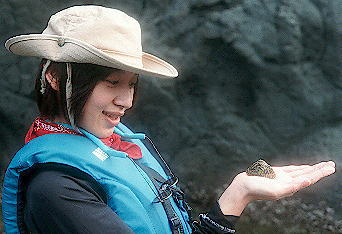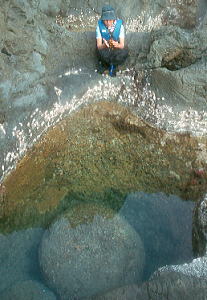 | 太平洋の荒波でできたポットホールとその中で磨かれた巨大な玉! どうやって持って帰ろうかと思案するaikoさん。 |