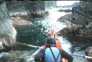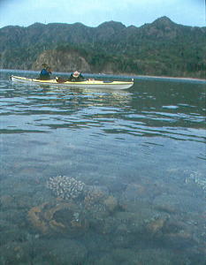 | 兄島瀬戸はとんでもなく潮流の早い所! せまいところでは父島と兄島の間の幅が400m。 流速は早い時で時速にすると8.5km/hくらい。 目で見てわかるくらいの流れがあり、川の瀬のように、一定のところで止まっている波があります。 潮波!タイダルレースとかタイダルラピッドとか言われているものです。 川の中上流くらいの流速である。カヤックで漕ぎだしてみると、あっという間に流れに乗ってドンドン進む。潮波が立ってるところに突っ込み、ワシワシ漕ぐ快感は他ではめったに味わえない。 小さい岬の裏はエディになっている。流れが反流となり、軽くウズを巻く。そしてラフな水面の間に油を流したようなヌメ−っとした水面のエリアがある。下から流れが沸き出ているボイルのようだ。 |