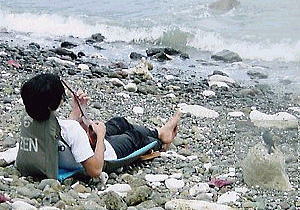 | 釣浜は静かなビーチ 潜ったり、ウクレレ弾いたりとノンビリすごす。 |