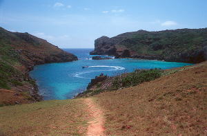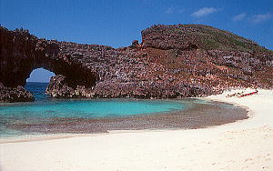 南島唯一の砂浜、扇池は眩しい、クラクラするようなところ。 |