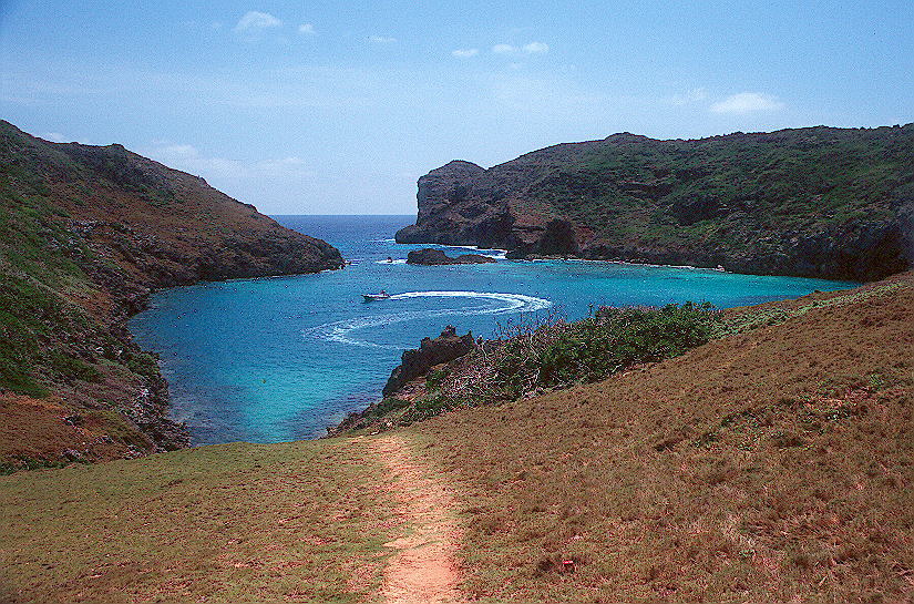 南島をトレッキング。 南部の湾はボートも入れる。 この島は特別保護区に指定され、一日の入島人数や、歩くルートが制限されている。靴底も掃除して外部の土(種含むかもしれないので)をもちこまないようにしている。 この世のものとは思えない美しい風景を残すために。 保護されて、ここの風景も10年前とは少し変わってきた。 かつてのカメラポジションは今は立ち入りが制限されています。 |