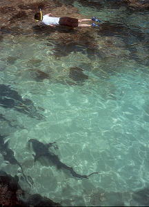 鮫がウヨウヨ! 安全と言われるホワイトチップシャークなので、シュノーケリングでいっしょに泳ぎました。 けっこう大きいのがいるでしょ。 シマロン嬢はすぐ上がれる岩場から見ていますが、セツはすぐ近くまで泳いで行きました↓。 |