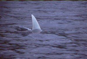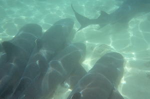 軟骨魚類のサメは、独特の泳法で、体全体をうねらせて泳ぎます。 ホワイトチップシャークの特徴はヒレの先の白い模様と口髭! いっしょに泳げるサメなので大感激! |