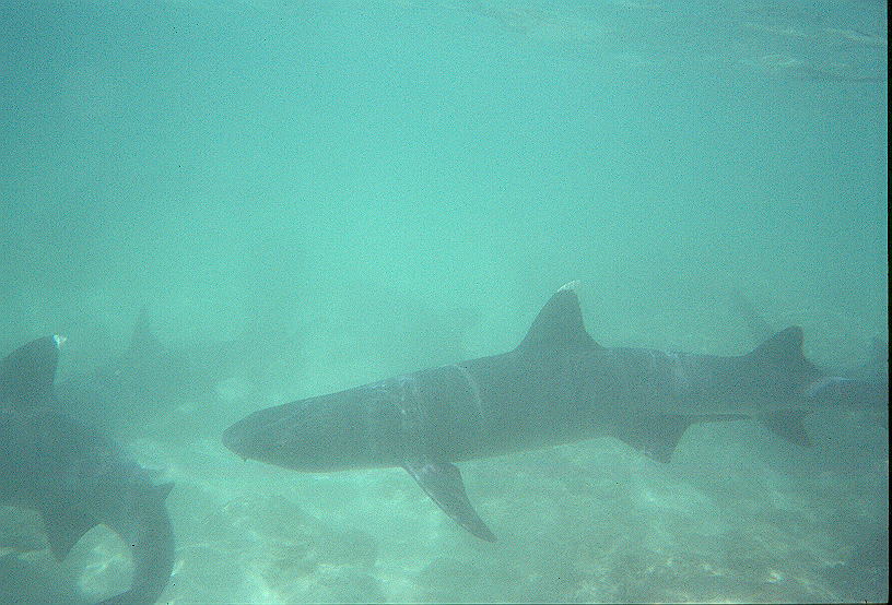潜るとたっくさんいます。 ここはほぼ95%はサメを見ることができるポイントです。 こんなに近寄ってもノンビリしたものです。 (ニコノス35mmレンズの距離) |