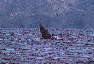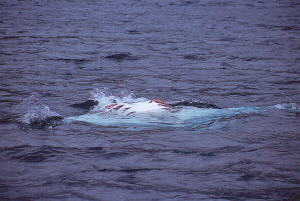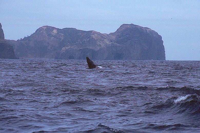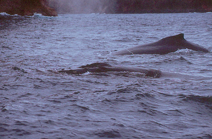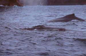 オスとメスのクジラ。 これがクジラの鼻の穴。頭の上にある。 薄くブローの上がってるのが見える。 |