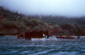境浦の沈船、太平洋戦争当時の魚雷を受けた濱江丸。年々浸食され崩れていく。かつては小笠原丸くらいの大きさがあった。 |