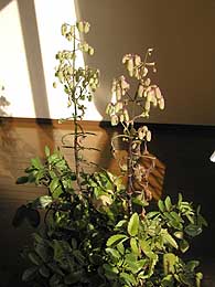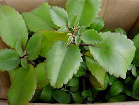 | 昨年よりつづき 我が家の「葉から芽」達は2階ベランダの植木棚に載っている。 今年も八月の風の強い日にたくさんの葉を落としていた。 昨年と違い成長した姉妹と叔父にあたる計4本からなので相当な枚数である。 (たぶん50枚程) 植木棚の周りには、トマト・ナス・ピーマン・シシトウ・イチゴ等等10個程のプランターが置いてある。 その中に多くの葉を落としていたのだ。 既にそれから二ヶ月近く経っている。 成長の早いものは、20cm程に成長している。 各プランターのもとからの主人を押しのけて、我が物顔に母屋をすっかり占領してしまっている。 運悪くプランター内に着地できずに、ベランダの板と板の隙間に落ち込んでしまった 葉もある。 が、しぶとく「葉から芽」状態となり、2〜3cmの分身が顔をのぞかしている。 あらためて、「葉から芽軍団」のしたたかさを思い知らされた気がする。 旧荘園の住民たちは、為すすべも無く養分を吸い取られ生気がなくなってきた。 正に「葉から芽軍団」の侵略だ。 原住民の全滅も時間の問題かとおもわれるが・・・・・ が、全てを圧倒して「我が世の春」を謳歌しようとしている奴らにも、浮かれすぎて 忘れている事がある。 「我が世の春」 ・・・・・・ 否。 既に秋になっている。 冬が目前に迫っているのだ。 暖かいサンルームに移動できるほんの一部を除いて おそらく、100以上の侵略者達は冬将軍の餌食となるだろう。 旧ロシアにおけるナポレオンの如く、砂漠と化したベランダ農園に全滅となる運命に あるのだ。 猛き人も遂には滅びぬ、盛者必衰の理である。 つづかない・・・・・・・ と言う事で、この哀れな難民直前の者たちを引き受けてくれる方はいらっしゃらない でしょうか? 上記は「葉から芽」を悪者にして書いたが、ご存知のように、実はとても可愛い奴ら なのです。 思えば一昨年小笠原ツアーの時拾ってきた、たった一枚の葉から三年目にしてこのよ うな状態になったのです。 悪者に仕立て上げた割には愛着があるのです。 冬将軍の餌食にするのは忍びないのです。 少しでも助けたいのです。 なんちゃって チャンチャン。