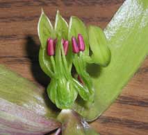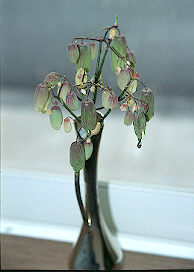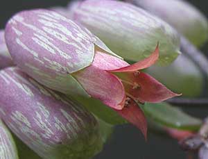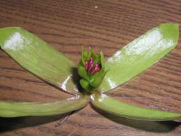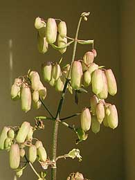 | やっと我が家のハカラメが花を咲かせました。 と言っても、「きれいな赤や白の花びら満開」と言ったものではなく 上部が少し赤っぽく、他は薄い緑色の袋状の花(?)です。 もちろん花粉とかおしべ、めしべなどは見当たりません。 (袋の中に有るのかもしれませんが、未だ未確認) でも、必要無いのでしょう。 なにせ葉っぱから芽が出るからハカラメ。 じゃあ何故花が咲く??? 眠れなくなりそうです。