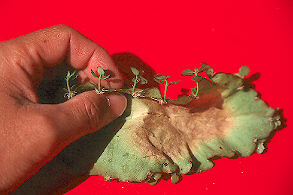 ///// / | - - | Good day! ( @ @ ) \ +o00o-()--o00o--------------------------------+ | | メール見ているだけの スミトモ です。 | oooo0 ( )----0oooo----------------------------------+ \ ( ( ) \_) ) / (_/ 99年の小笠原ツアーに参加。 拾って持ち帰ってきた「はからめ」を忘れていたのに気が付いた。 バックの中(シュノーケル水中メガネの中)に入れておいたのを思い出した。で10日後に死にかかった(ヨレヨレ・シヲシヲ・裂けてもいた)を小皿に移し、霧を吹いて蘇生させた。 結果、あまり元気とは言えない「葉から芽」状態になった。でも、自分の不注意から駄目にするところを助かって嬉しかった。 その後、更に注意して三日に一度程度の霧吹き養生。 持ち帰った、親葉は枯れてしまったものの、小さな子孫を残したのです。 5o程度の子葉が三枚。 小さな植木鉢に移植して、養生したところ、2つが背丈10cm程に育ちました。 安心してほっておいき、鉢棚の下で横になったままになっていたのに気が付きませんでした。多分猫の仕業なんでしょう。 こいつはその為かヒニクレタのか、葉も落とし(3cmぐらい)、あまり成長しません。 冬に近い秋には一本は身の丈30cm、ヒニクレ者も15cmほどです。 また、「落とした葉からも芽」で七味のトンガラシのごとく、ただ赤いと判るだけの点がいくつかありました。 話が大分長くなってしまいました。結論です。 現状は、30cmなった長兄は、霜枯れを患い敢え無く他界。 一度はヒニクレたものの弟は身の丈17cmほどで元気に健在。 七味トンガラシも葉の長さ1・5cm程ながら肌つやの血色も良く、先の成長が期待されます。 結局、子が一茎残り、孫が三つ育ちつつあります。 今年は花を咲かしたい。