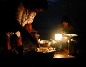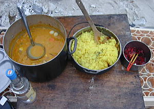 今夜はサフランライスにタイカレー! これがまたオリオンにあうんです!住友さんはすでにアワモリに移行! この夜、風が強くて、テントを飛ばされた人もいた。 |