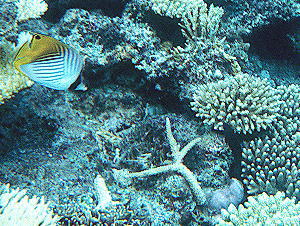 サンゴの種類が豊富。チョウチョウウオ。 |
