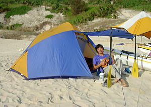 テントはシェラ・ルックアウトCD.ドアパネルがオーニングとして張り出す。パドルをうまい具合に支柱にできる。 ウクレレは今回はリラング・モデル9220の15F。 『岬巡り』なんぞを弾いてるところ。 |