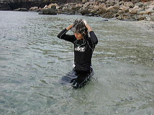 海水で泡立ち、しかも生分解してしまう万能シャンプーで頭を洗うサツキさん。 屋嘉比島で。 |