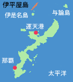 伊是名島(いぜなじま) ・今帰仁(なきじん)運天港の北27.8Kmの地点。 ・フェリーで55分。 那覇からの直行飛行機で40分。 ・伊是名村 人口1.783人 戸数799 (平成19年7月31日現在) ・伊是名島の周囲は16.7Kmでほぼ円形。 ・伊是名村は伊是名島(14.14平方キロ)の他、屋那覇島(0.74平方キロ)、具志川島(0.47平方キロ)、降神島(0.07平方キロ)の三つの無人島からなる。 ・ハブはいない。 ☆伊是名村HP |