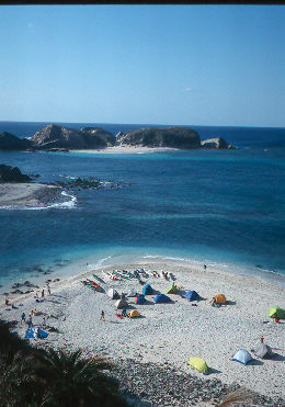 | Photo:外地島南端でキャンプ。本当は対岸の小さなムカラク島に泊まりたかったが、今回は先客がいた。椎名 誠氏とあやしい探検隊。 VTRの撮影の時です。販売されたVTRの中で、対岸にいたカヤッカーというのがわれわれ。 |