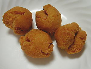サーターアンダギー 沖縄の伝統的なドーナツです。 ほんのりとした甘味。サクッとした食感。 胡麻入りバージョンもあります。 昼食の+アルファやオヤツに最適! これも毎年買って帰ります。 以下、泡盛之助殿からいただいたウンチクです。 アンダーギーとは「アンダー=油」「ギー=あぎ=揚げ」つまり、油で揚げることを意味します。サーターアンダギー(直訳すれば砂糖油揚げ)「砂糖てんぷら」は特に有名ですよね。 また、おふくろの味を意味する沖縄の言葉で「ティアンダー」という言葉がある位です。「手前味噌」ならぬ「手前油」ですね。沖縄では昔からの習慣で、味噌汁に油をたらしていただくご老人も多いとのことです。油を使って調理するのが沖縄料理の大きな特徴と申してよいでしょう。 |