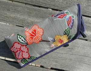 琉球王朝時代から続く伝統のある、沖縄の代表的な染物―紅型(びんがた)。 東南アジア、中国から伝わった染色技法と日本の友禅の影響を受けながら、沖縄の自然・風土が融合して生まれた琉球独自の染色技術です。 琉球王朝に庇護され、当時は王族や士族しか着用することができず、身分によって図柄や色が区別されていましたそうです。 着物、シャツやハンカチなど色々な製品があるけど、サングラスケースでいい柄を見つけました。 |