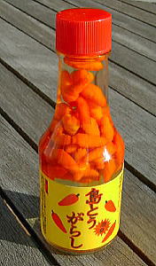 コーレグースもけっこうオススメです。 泡盛に唐辛子を漬け込んだもので、パーソナルな調味料として使います。 うーん、タバスコのようなモノと手っ取り早く表現する人もいます。でもタバスコはナベやウドンには合わないけど、コ−レグースはそれらにも合うし、さらにパスタにもあいます。湯豆腐にもチョロっとたらすといいですね。 何か一味足りないようなときに、自分のドンブリにチョロっと掛けるとうまさがまします。 溶け込んだ泡盛が絶妙のウマミをだしてくれますね。 ケラマツーリングでは食事の時に出ますので、使ってみてください。 我が家では常備してますよ! 『 コーレグースについて 泡盛之助 これを沖縄そばにかけると味がぐっと引き立ちますよね。「コーレ」とは「高麗」がなまったもので、琉球王朝時代に朝鮮から伝わったようです。 』 |