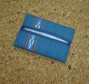 八重山のミンサー織 ざっくりした風合いの素材とシンプルなデザインを気に入っている。 上は巾着袋。けっこう厚手。 下はティッシュケース。 |