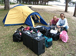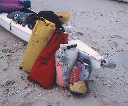 パッキング例。私の装備。右から、 透明な10リットルの防水バッグ:ライト・洗面用具・救急セットなどの日用品。 半透明20リットルの防水バッグ:着替え・寝袋 赤い33リットルの防水バッグ:ウクレレ・譜面 黄色33リットルの防水バッグ:テント・マット (以上がタンデムのリアラゲージに入りました) 後ろの黒いのはデッキメッシュバッグに水中マスク・シュノーケル・フィン・食器 クレイジークリーク(座椅子) 他にカメラ(ニコノス・防水パックに入ったCanonイオス・メモ用のコンパクトカメラ) クマのぬいぐるみは無人島に漂着してた物。 |