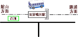 | JR安房鴨川(あわかもがわ)駅から徒歩1分です。 改札前ロータリを出て右へ少し歩けば見えます。 高速バスの場合は、駅の西口に着きます。駅を陸橋で越えて、海岸口(東口)に出てください。