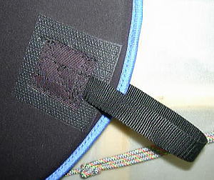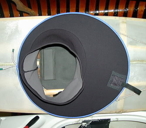 | 写真はヒガちゃんのハンドメイド・スキンカヤック用の特注スプレー・スカートです。 木製コーミングにセットされた、まん丸型のものです。 |