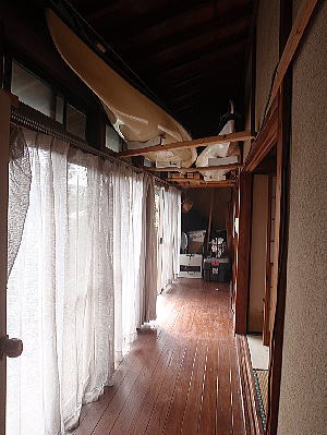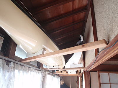 | 日本家屋のお庭に面した縁側廊下。友達との交流の場だったり、日向ぼっこの場だったりする。ミケのお気に入りの場だったりします。 その縁側の廊下ってのは案外長い。そしてその上あるデッドスペースがカヤックのいい棲家になるのですねー。 うらやましい環境です。 N家のそこには、ソランダープラス(ニンバス)とソルスティス(カレント)が二艇収納されていました。 |