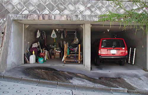 ので、10年前の改築の際道路側の壁面をぶち抜き、そこに車2台が入るガレージを作りました。 現在左半分を艇庫に使用しています。 欠点は湿気があって、夏場にカビが湧 くように生えることです。 』 |