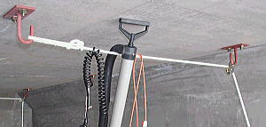 ソランダーを下のラックに、ハルシオンを天井に吊っています。 艇庫を作る際、天井に6ヶ所頑丈なフックを付けてもらいました。重宝しています。 |