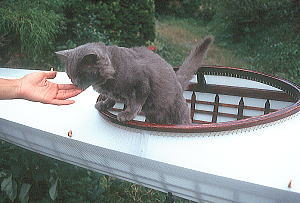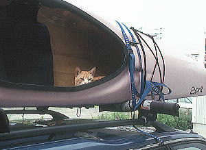 ネコはカヤックの中が大好き! この2枚の写真のネコたちは紳士的ですが、 シートパッドを爪研ぎでメチャクチャにされた人、中にオシッコされた人、中でお産されちゃった人などが後をたちません(実話!)。 |