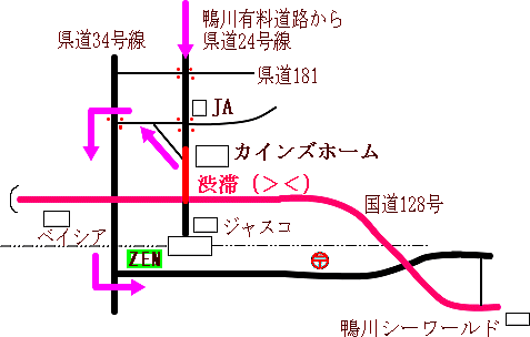 ・鴨川有料道路から県道24号線を通ってZENへの道。 ・連休や春休み・夏休みに鴨川市内が渋滞するのは 鴨川シーワールドへ入るクルマがつながります。 ・国道128号線は長く渋滞して、県道24号線も混みます。 ・市役所北のカインズホームまでもつながっていたら、 渋滞回避路に回った方がいいです。 けっこう時間をくいます。 ・カインズホームやや南から田んぼの中を斜めに進む道。 矢印通りに県道34号線に出ます。 ・JR踏切越えてすぐの信号を左折すればZENは近いです。 ・カインズ北のJAの信号までもつながっていたら、そこで 右折です。 |
