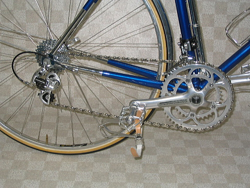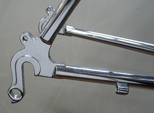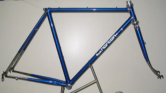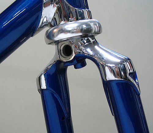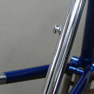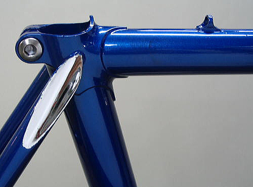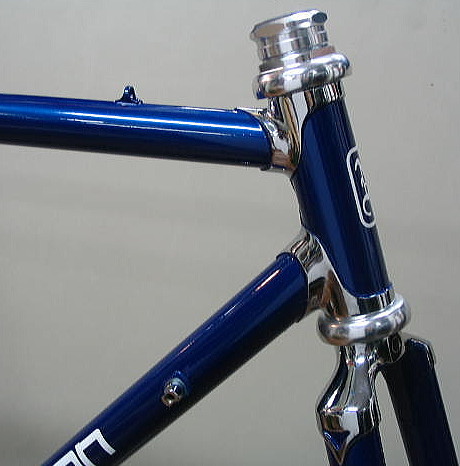 | ストロボ撮影だと明るめに映るメタリック塗装。実際はもう少し深い色です。 下のヘッド写真くらいの濃さ。 カラー指定は、気に入った色のクルマのタッチペンを塗装工場に提出して色あわせしてもらいました。 マツダのスポーツカーの色です。 メッキ仕上げは納期がけっこうかかってしまった。 メッキ箇所:ヘッドラグ・フォーククラウン・前後フォーク剣先・シートステイキャップ。 シートチューブ(C-T):520mm トップチューブ:525mm チェーンステイ:425mm フォークオフセット:50mm |