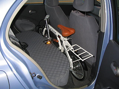 | プジョー・コリブリを後座の足元に 車体は畳めません。 ハンドルステムを畳んでいるけど、そのままでもOK! 16インチ、ホイールベース、マッドガード、キャリア付きですっぽり入ります。 クルマで出かけて気軽にポタリングするのに向いてますね。 しかもクルマは日産・マーチです!!車幅 これはカヤッカー・アヤさんのマーチにお友達のマメちゃんのコリブリ。 |
