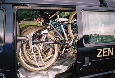 | マツダ・スクラム ZENで90年代に使っていた軽ワンボックスのスクラム。 これも内部はだいたい同じような容量です。 たくさん入ります♪ マウンテンバイク7台入りました。左右の2台は前輪を外し、ハンドルを直角に切っています。 |