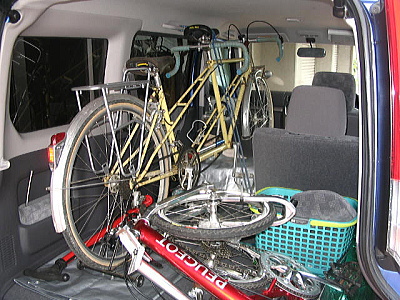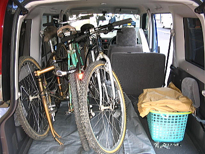 後席は半分づつ分割で倒せます。 これはZENのバモスです。写真は後席1/2の3人乗り状態で、MTBを3台もOK! 左のMTBの前輪を外してハンドルを直角に切っています。 この方がより納まりがいいですが、もちろん完成のままでOK。 ラゲージスペースが減ってしまったのは、しかたないです(><) キャンプ道具となると、ジェットパック(ルーフボックス)の追加も考えねばなりませんね。 う〜ん、ジェットパックほしい! |