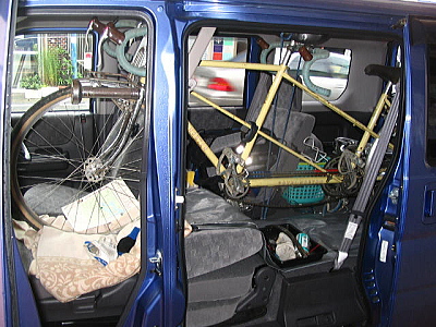 | 26インチのタンデムランドナーも助手席をフルリクライニングにすればスッポリ収まります。 運転席+後席1/2なので、もちろんタンデム収納状態でクルマに二人乗車可能です。 |