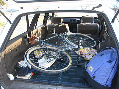| ステーションワゴンは後席を倒せば大きな荷物室ができるので、 ほとんどの自転車をそのまま積み込むことができます。 |