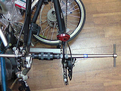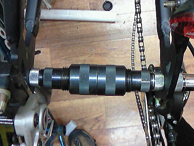 | 左右平行度を出してから、内幅をチェックすると、135mmをわずかにマイナスでした。 平行度が悪くて、しかもアンダーサイズでは車輪をフレームに入れるさい、エンドを開かなくてはならないのは無理もないことですね(><) 左右エンドをほんのわずか拡幅してあげます。 |