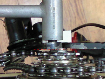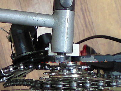 | ヒネリから治します。 ディレイラーを外して、カンパニョーロのディレイラーブラケット修正工具をネジ込みます。 ん?なんかヘン???? ディレイラーブラケットがねじれてるのではなく、なんと取り付けネジ穴自体が斜めにあいてるのです! はれ!?こんなのは初めてです! 完璧に治すには、穴を溶接で埋めてネジ穴を開け直すか、エンドを交換しなくてはなりません。どちらも火を入れるので、塗装はやり直しでしょう。 かなりの大事、まあ現実的にはネジ穴が車軸と平行になるようディレイラーブラケットをひねって修正するしかないでしょう。 |