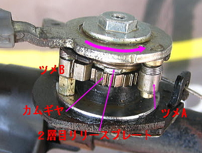 もう一度、リリースレバーを操作するとリリースプレートがツメを浮かせて、カムギヤがバネで戻ります。 これがスタート位置(インナーギヤ)に戻った位置です。 |