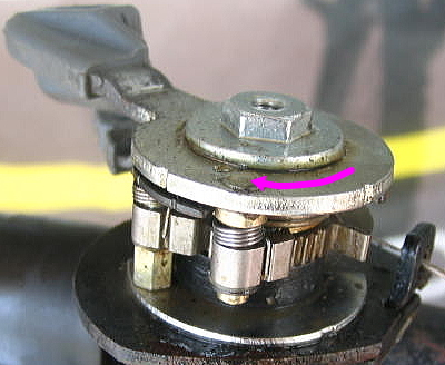 メインレバーから親指を離すと、レバーは元に戻り、カムギヤは一番向こうへ行ったまま。 |