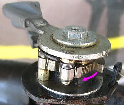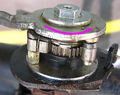 メインレバーをまた押すと、ツメAは新たな位置からカムギヤを押して、3速目(アウターギヤ)に入ります。 ツメBがカムギヤに食込んで位置を決めます。