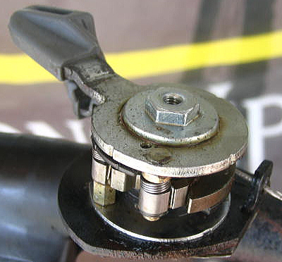 写真はわかりやすい大きめな造りの旧式なプッシュ&プッシュタイプですが、プッシュ&プル方式も基本はいっしょ。 本来はハンドル下に位置してますが、作業のために、バーの上に逆さの状態です。 説明での上下は写真上での上下です。 写真は左レバー(フロントチェンジ用)です。 |