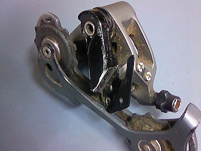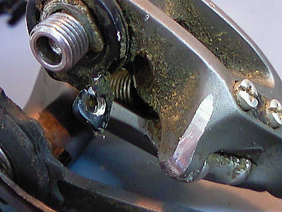 | 同じオーナーの方から、半年後にまた修理依頼が入りました(><) 同じトラブル。エンドはチギレていませんが、かなり曲がってます。エンド取り付けボルトも歪んでいました。 ディレイラーのスプリング押さえのアジャストビスは半分チギれ、そのベース部もチギれかかっています。 上とまったく同じ修理です。 (削れた箇所にも新たな傷があります(><)) おまけにプーリーケージも曲げてしまいました。交換です。 そちらは別ページを参照してください。 エンドの修理はこちら。 |