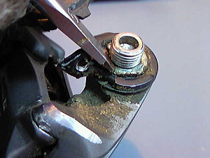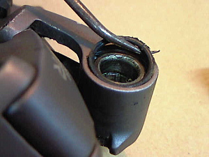 スプリング押さえはテンションが掛かっているので、これも飛ばさないように注意しながら外します。ウエスを被せてやった方がいいかも。 少しひねっただけで外れます。 内側にプラスチックのダストカバーがあるので、なくさないように。 向きもチェックしてください。 凸が外側で本体にはまります。 |