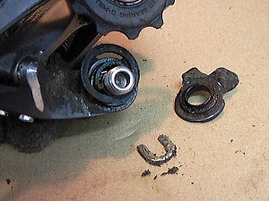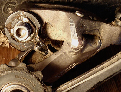 | シマノのMTBコンポーネントのフラッグシップモデルXTR。M952。 今回は枝を巻き込んだまま踏み込んでエンドを破壊してしまったトラブル。 XTR RD(リヤ・ディレイラー)も跳ね上げられ、リプレースメントエンドにガッチリ食込んで動かなくなってしまいました。 よく見ると角度調節のBテンションボルトがモゲて、メネジ部もチギレていました(><) 本体の削れた部分はエンドに食い込んで、えぐれた個所です。かなり痛々しいです。 はまり込んでいて外すのがけっこうたいへんだったです。 この部分の交換はアッシー交換なのでグリスアップしてしまいましょう。 他のシマノのディレイラーでもだいたい同じ手順です。 エンドの修理はこちら。 |