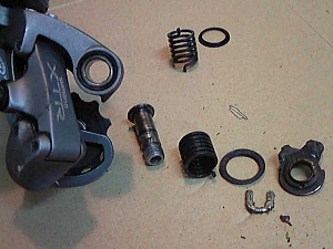 XTRはOリングを多用したシール性の良いメカです。B軸まわりでも2箇所使っています。 OリングというとOリンググリスがベストと思い浮かびますが、それはシール性は優れているのですが、潤滑性に劣るので、ここではゴムへの攻撃性のないスーパー・リューブグリスを使いました。 Oリング・B軸・スプリング・シール・スプリング押さえに塗布しておきます。 | |