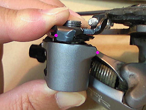 スプリング押さえをはめ込んで、スナップCリングでロックするまでが山場!苦労するところです。 スプリング押さえは、スプリングに抗して反時計回りに回転させ、本体のストッパーに引っ掛けます(写真ピンクの点を合わせます)。 |