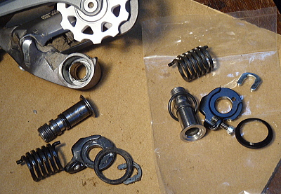 スプリングは手で外せます。 B軸は裏側から押し出すと外れます。 軸にOリングが入っているのでやや固めです。 写真上段は新しいスプリングとOリング。 |